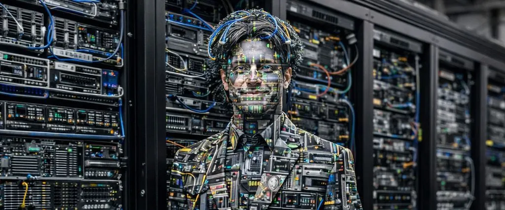 Person with digital circuitry overlay standing in a data center server room, representing cybersecurity risks and technology infrastructure.