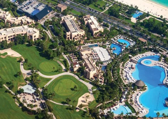 Aerial view of a luxury resort complex featuring multiple swimming pools, landscaped gardens, and golf course areas surrounded by tropical greenery.